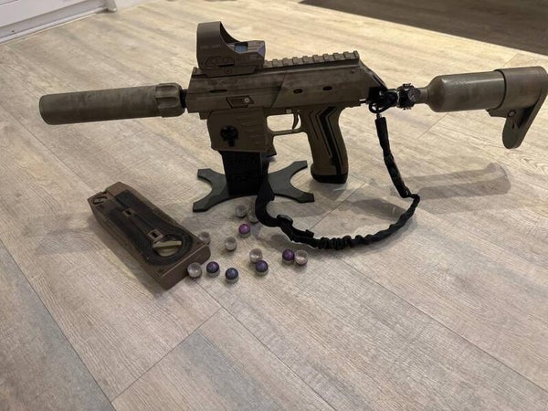 Optional könnt ihr noch einen Schalldämpfer mitbestellen der perfekt zu MP7 passt. Dieser ist perfekt abgestimmt auf den CS Z03 von CS Innovation in 9" Länge ( ein kurzer Lauf der es ermöglicht die S63 Hülsen zu verwenden und es ermöglicht FSR wie Roundballs zu benutzen). Es kann natürlich auch jeder andere Lauf verwendet werden. Im Beispiel ist ein 9" Lauf verbaut .