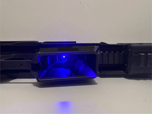 Hier biete ich euch eine Mini Version eines UV Tracer. Dieser wird in den Original Body oben beim Hopperfeed angeschraubt Und mit zwei Knopfzelle betrieben. An der Batterieeinheit ist ein On Off Schalter.